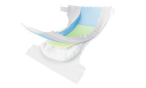 Zu unseren aktuellsten Neuentwicklungen geh?rt ebenfalls das Backsheet, welches hydrophob ausgerüstet ist und somit verhindert, dass Flüssigkeit aus der Windel austreten kann.